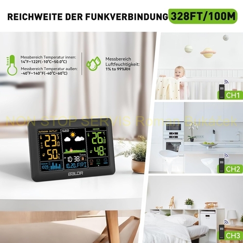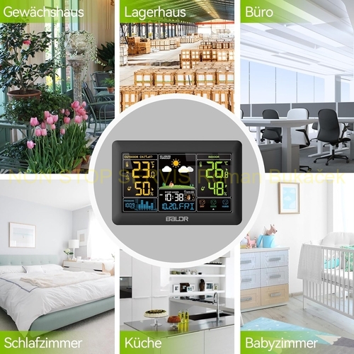 Bezdrátová meteorologická stanice BALDR s venkovním senzorem, rádiem řízené hodiny DCF, velký barevný displej s vnitřní a venkovní teplotou/vlhkostí, stmívatelné podsvícení displeje, předpověď počasí, tlak vzduchu, fáze měsíce, atd.