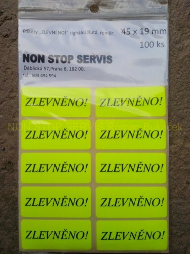Etikety - potisk "ZLEVNĚNO!", signální žluté, rozměr 45 x 19 mm, 100ks / balení.
